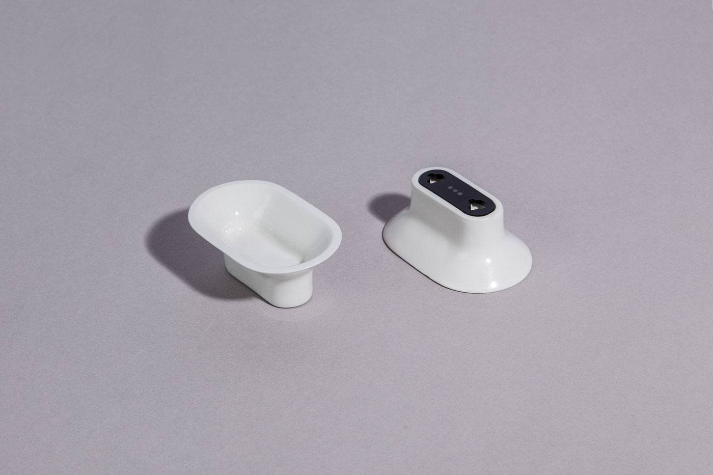Flare is a modular coat hook made of slip cast porcelain or stoneware. It can be placed directly on the wall or snapped onto a bleached oak backing plate. Its unique geometry and a simple integrated mounting bracket enable 2 hanging orientations.
